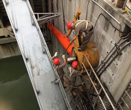 正值汛期,但是水電站的維修不能等。圖為我公司維修人員頂著酷暑,在高溫下對大型水電站表孔弧形閘門液壓啟閉機(jī)進(jìn)行大修的現(xiàn)場